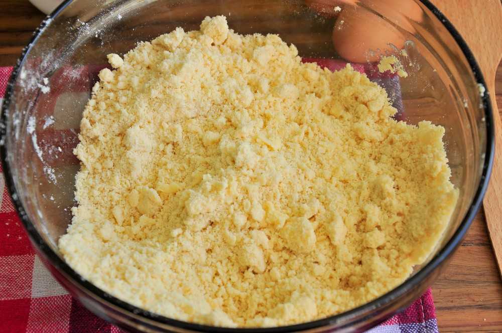- Потом все продукты перемешиваются. Из них делается рассыпчатое, нежное тесто, которое кладется в холодное место на два часа.
