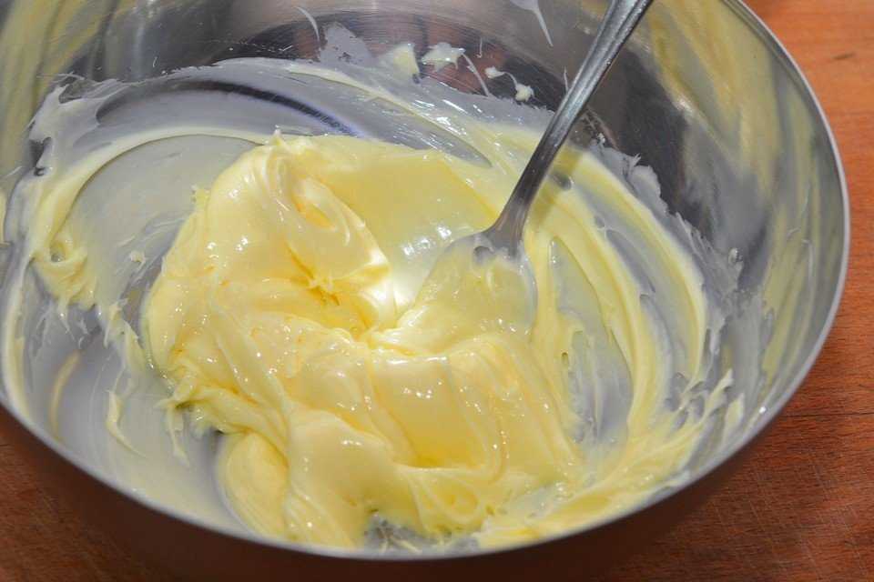 1. Сливочное масло либо сливочный маргарин нужно оставить при комнатной температуре приблизительно на полчаса. Размягченную жирную основу нужно взбить при помощи миксера в пышную кремовую массу.