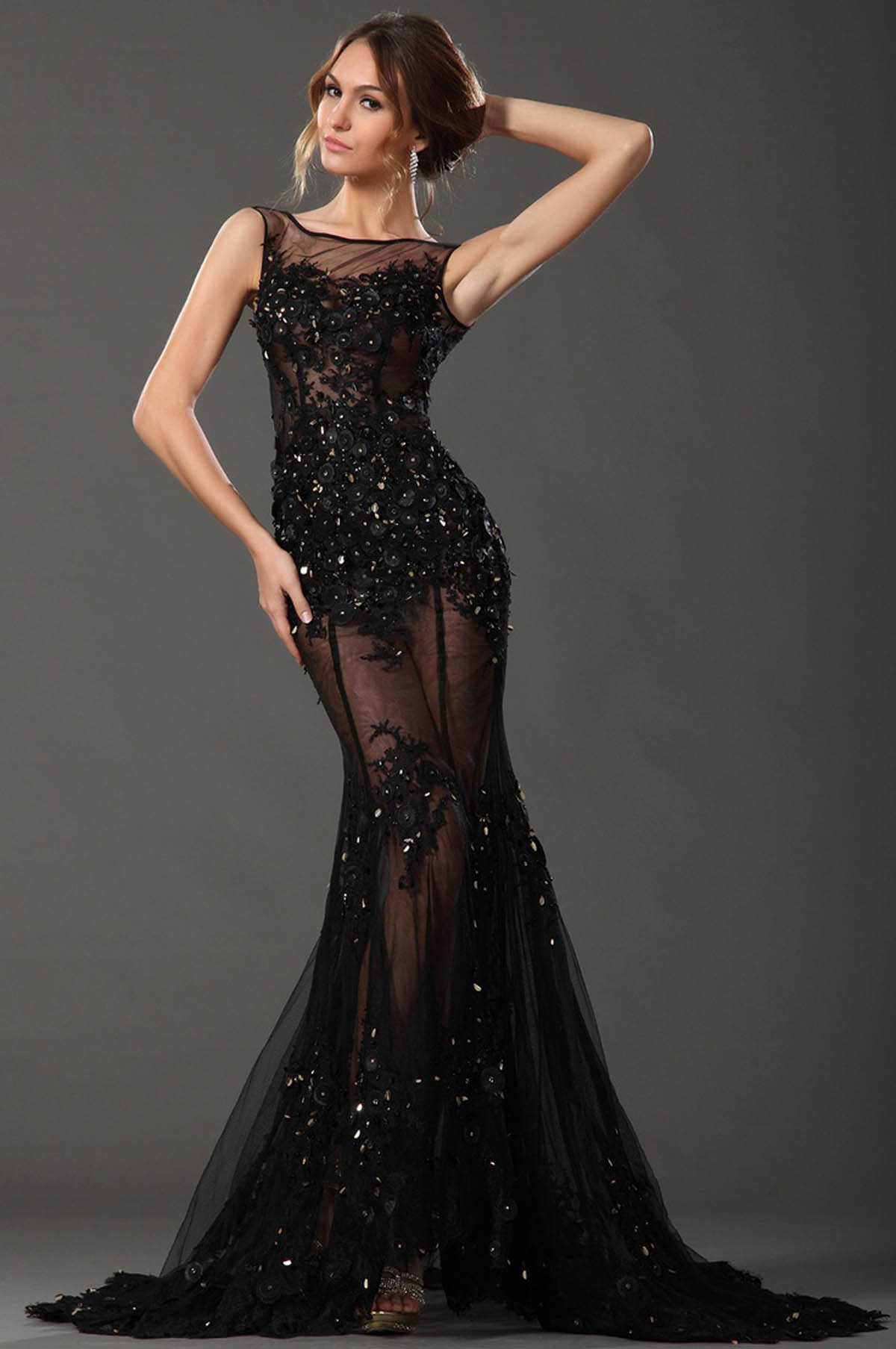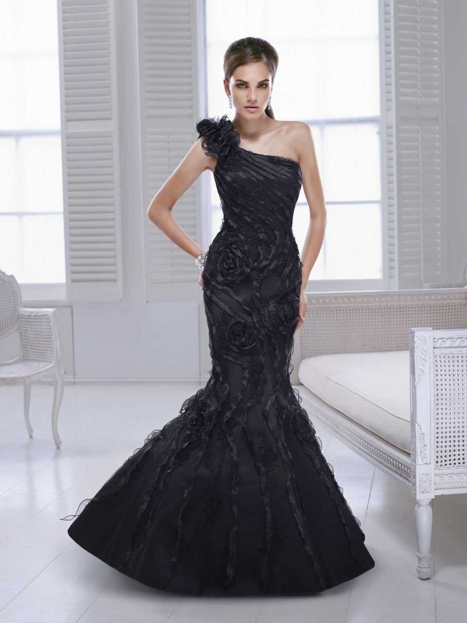 Черное платье рыбка в пол – поистине эталон элегантности и шика. Наряд черного цвета уместен на любой вечеринке, вне зависимости от масштаба и места проведения. Черный отлично стройнит и визуально вытягивает фигуру, оставаясь вечно на гребне модной волны с легкой подачи иконы стиля Коко Шанель. Изделия в черном цвете, богато украшенные камнями и стразами, способны побороться за титул самых роскошных вечерних нарядов.