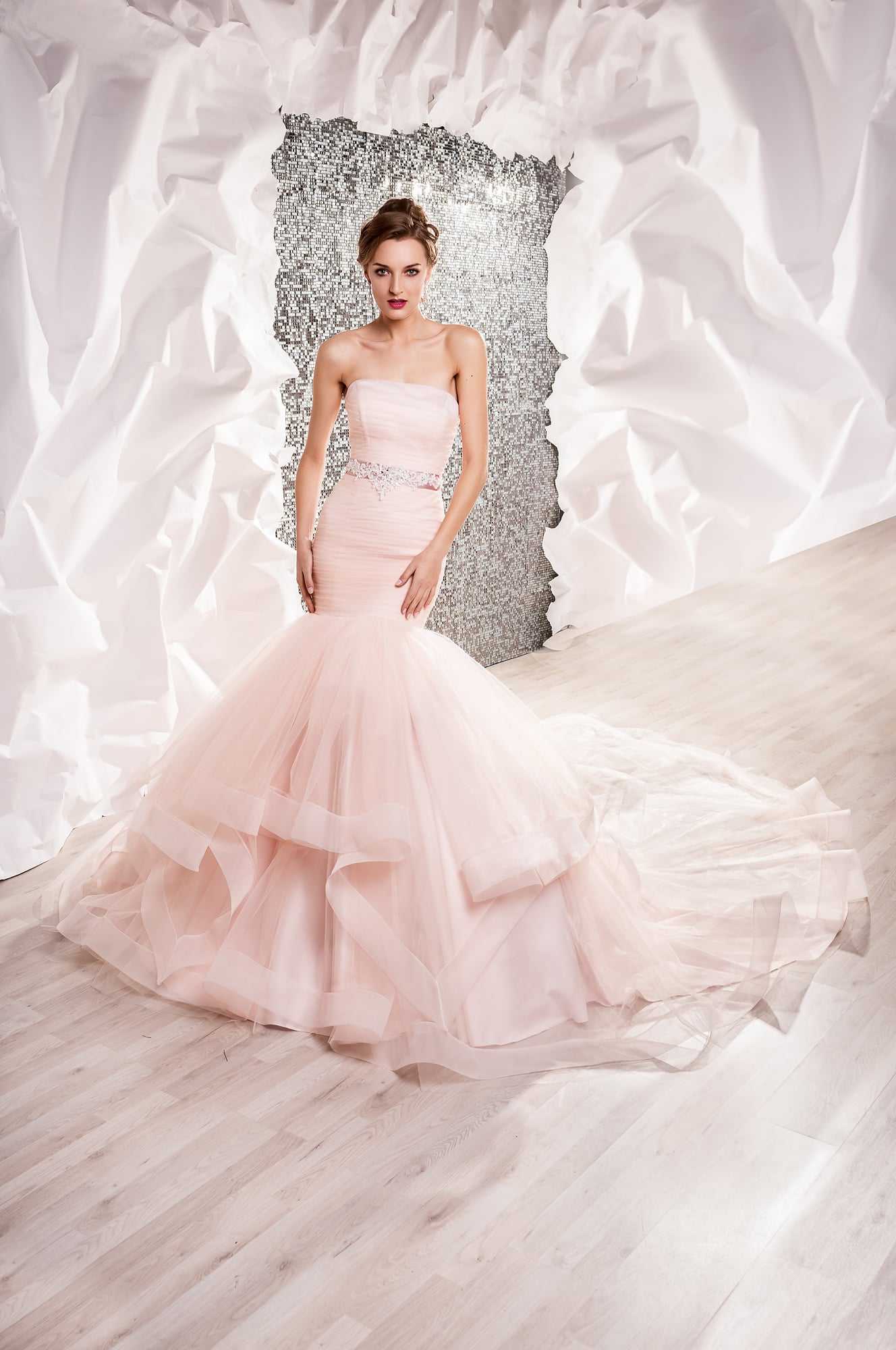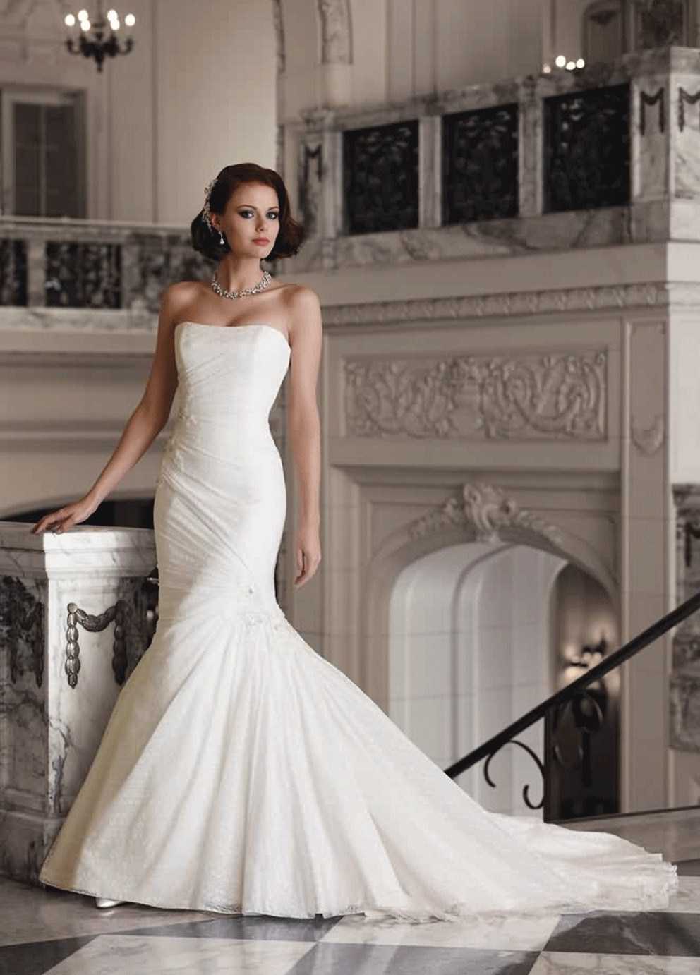 - Платья со шлейфом визуально вытягивают фигуру, позволяя невысоким девушкам казаться выше.