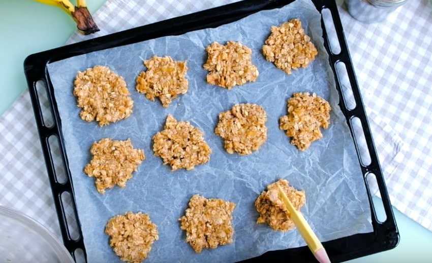 - Противень застилаем пергаментом, ложкой выкладываем смесь и формируем не очень толстые печенья.