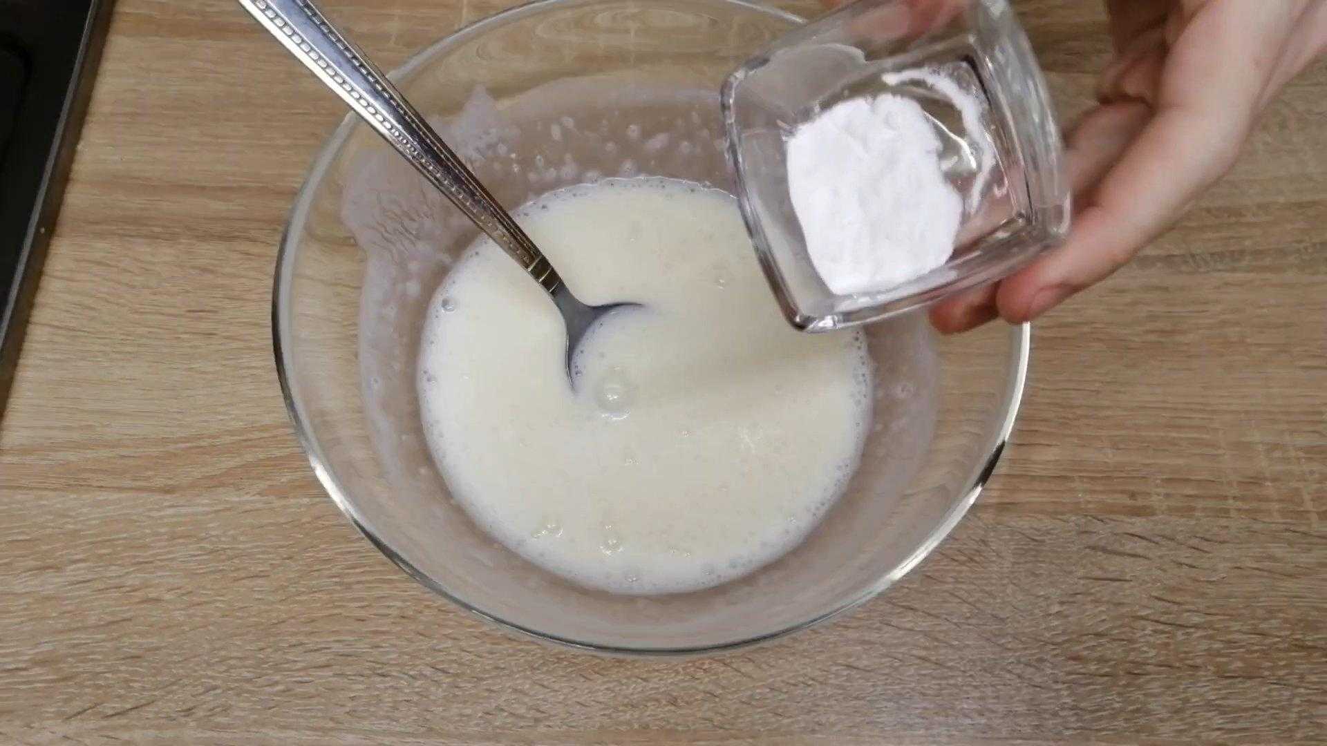 - В отдельной чаше соединяем кефир с содой и сахаром, размешиваем до растворения сахарного песка.