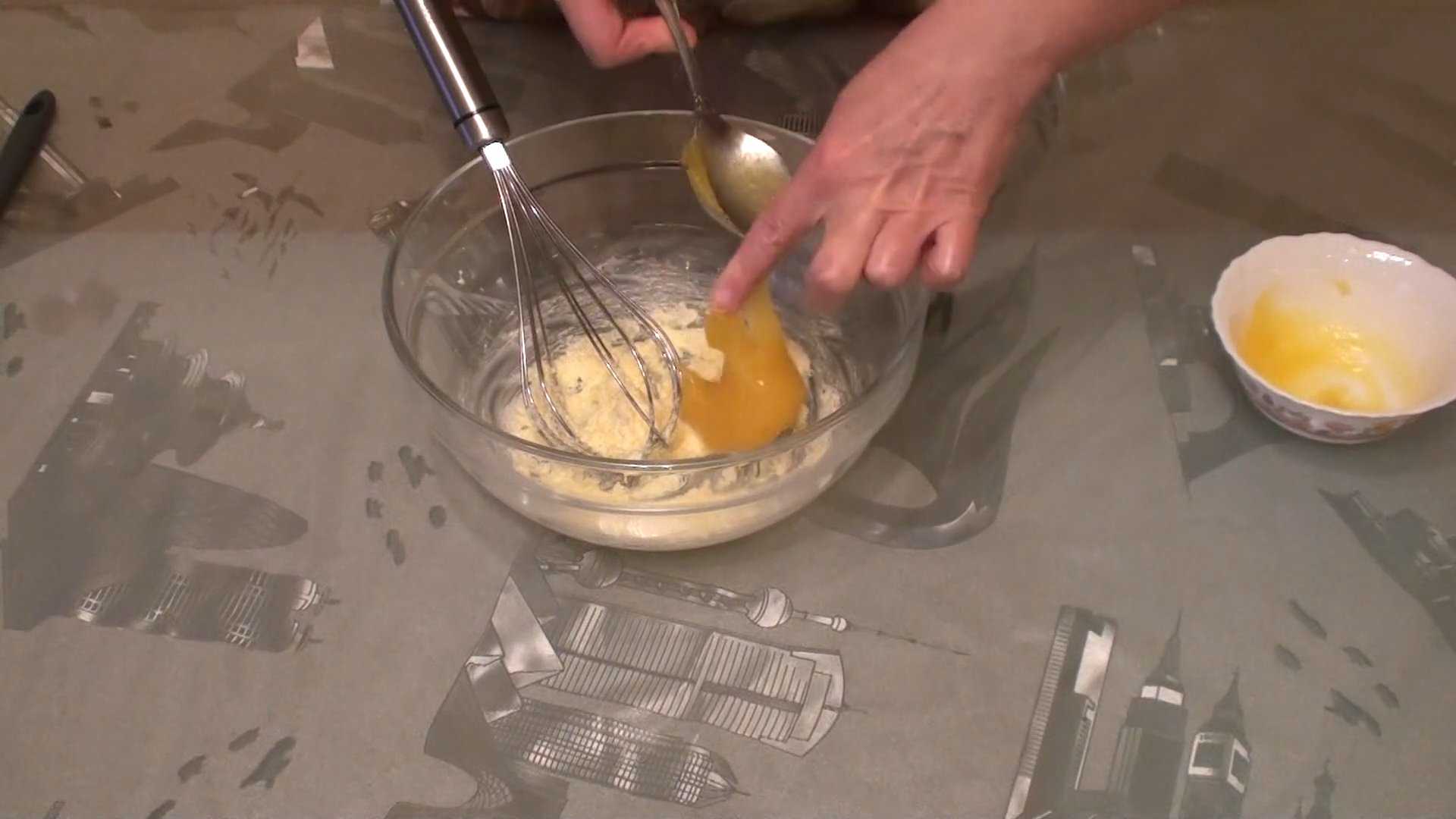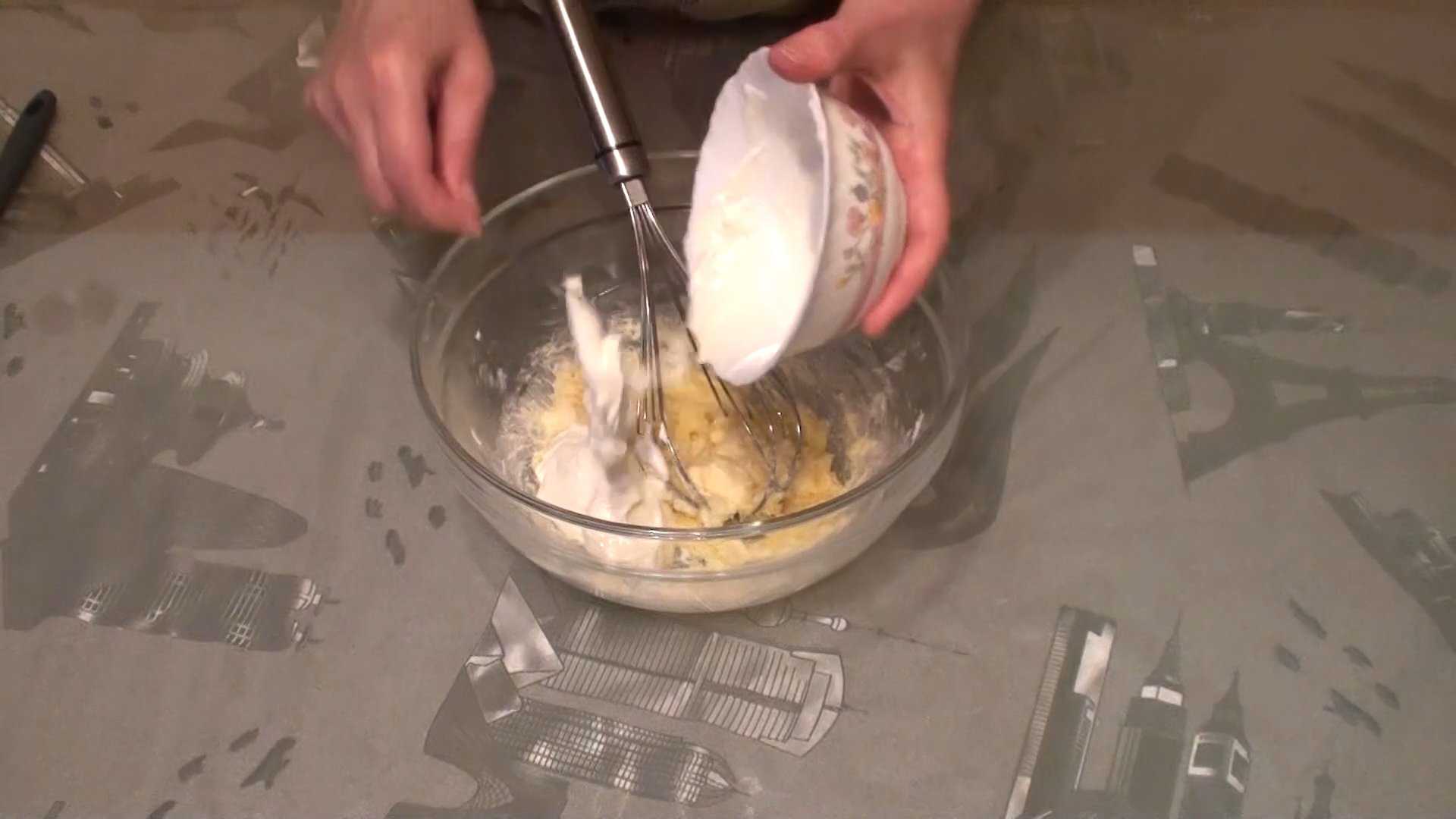 - Растереть масло с сахаром, ввести яйца, разрыхлитель и муку, замешивая мягкое тесто.